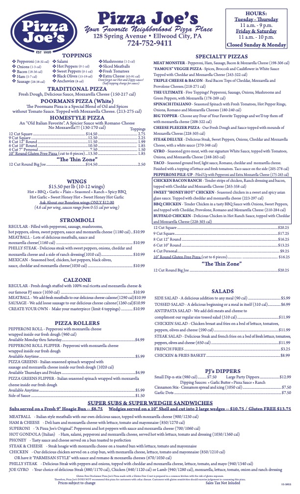Nestled in the heart of Ellwood City, Pizza Joe's offers a menu bursting with flavor and community spirit. Known for their expertly crafted pizzas, including fan favorites like the hearty taco and loaded meat lovers, each dish is an explosion of freshness and taste. Customers rave about the generous portions that can feed a crowd, making it an ideal spot for family gatherings or casual nights out.